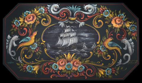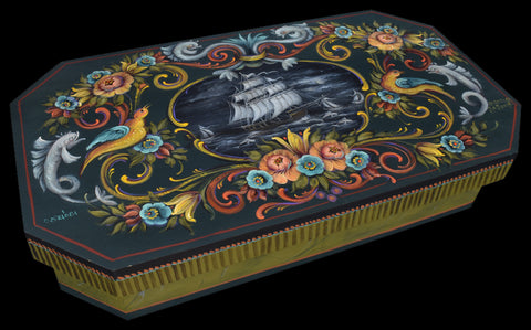 Originally designed to be a gentlemen's gift box. The absolute perfect painting style to use with a more masculine theme would be Hindeloopen. This is a style still enjoyed by a number of artists in Hindeloopen today. So we’ll take our inspiration from the works of an earlier artist, Gerardus Steven Huttinga, 1883 - 1963. And from his inspiration I’ve developed this simplified, slightly softer look which is wonderfully fun to paint and very decorative. For ease of presentation, let’s divide the painting into about five subjects: scenes, scrolls, birds and flowers, and brush sketching for inside decoration of box.