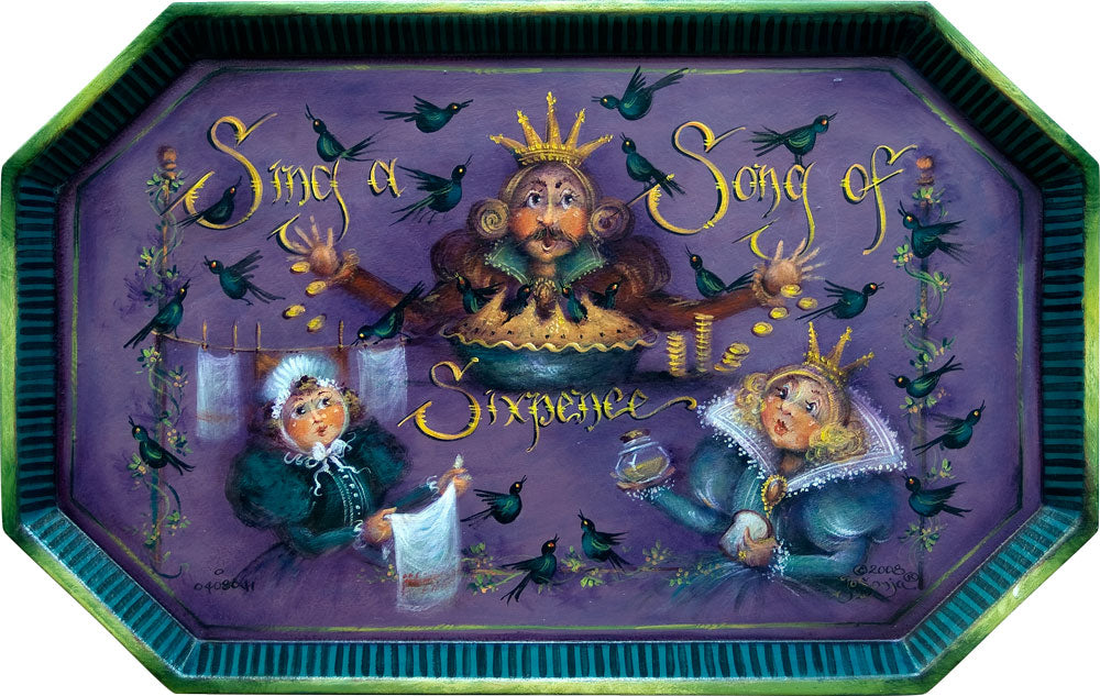 This delightful old English nursery rhyme was the inspiration for this painting. And yes, there are 4 and 20 blackbirds around the edges of the tray. Done in a simple stroke style, they are fun to do. The faces are what I call character faces, so no stress here, because you can experiment with the look you want each one to have.